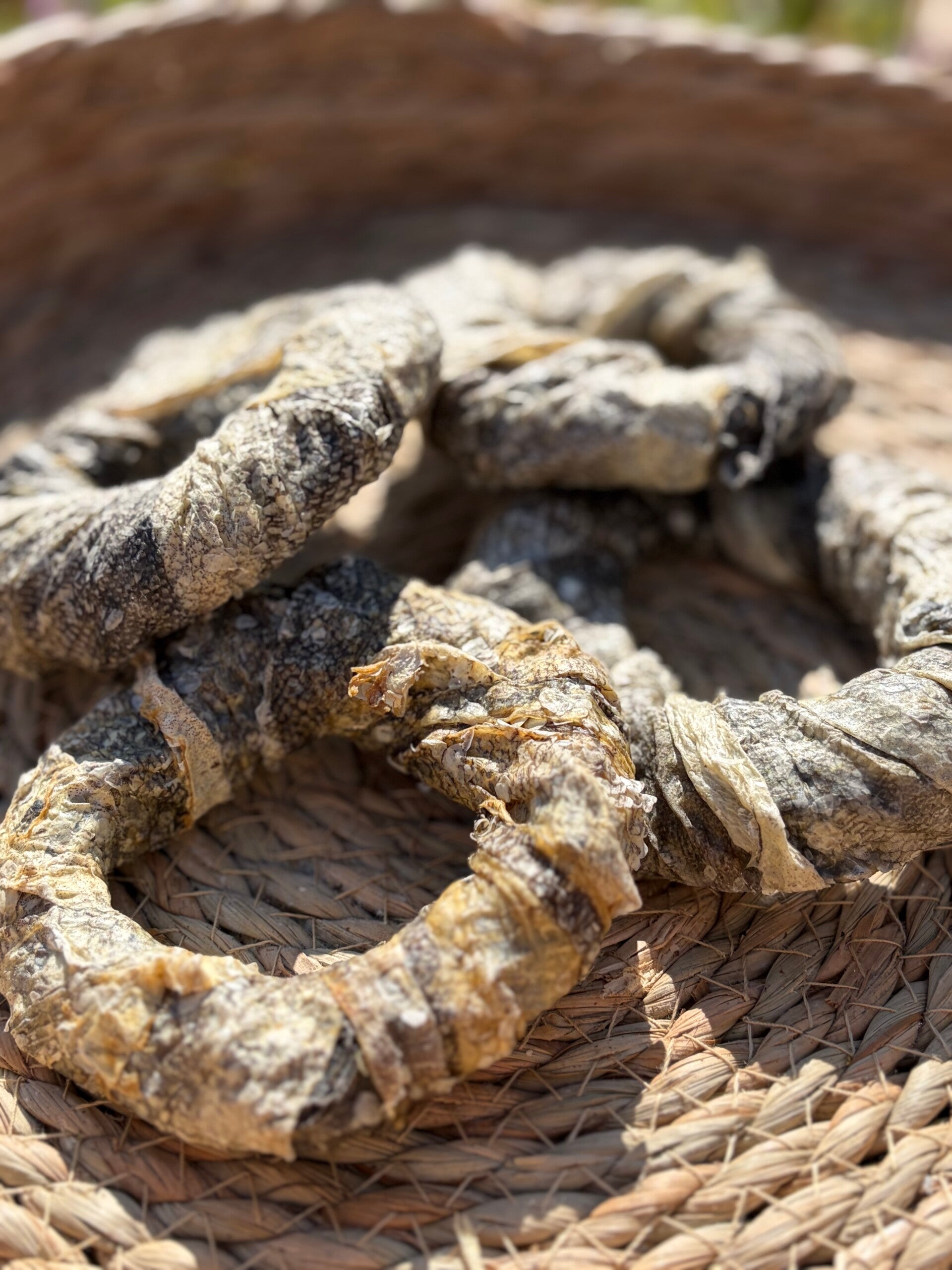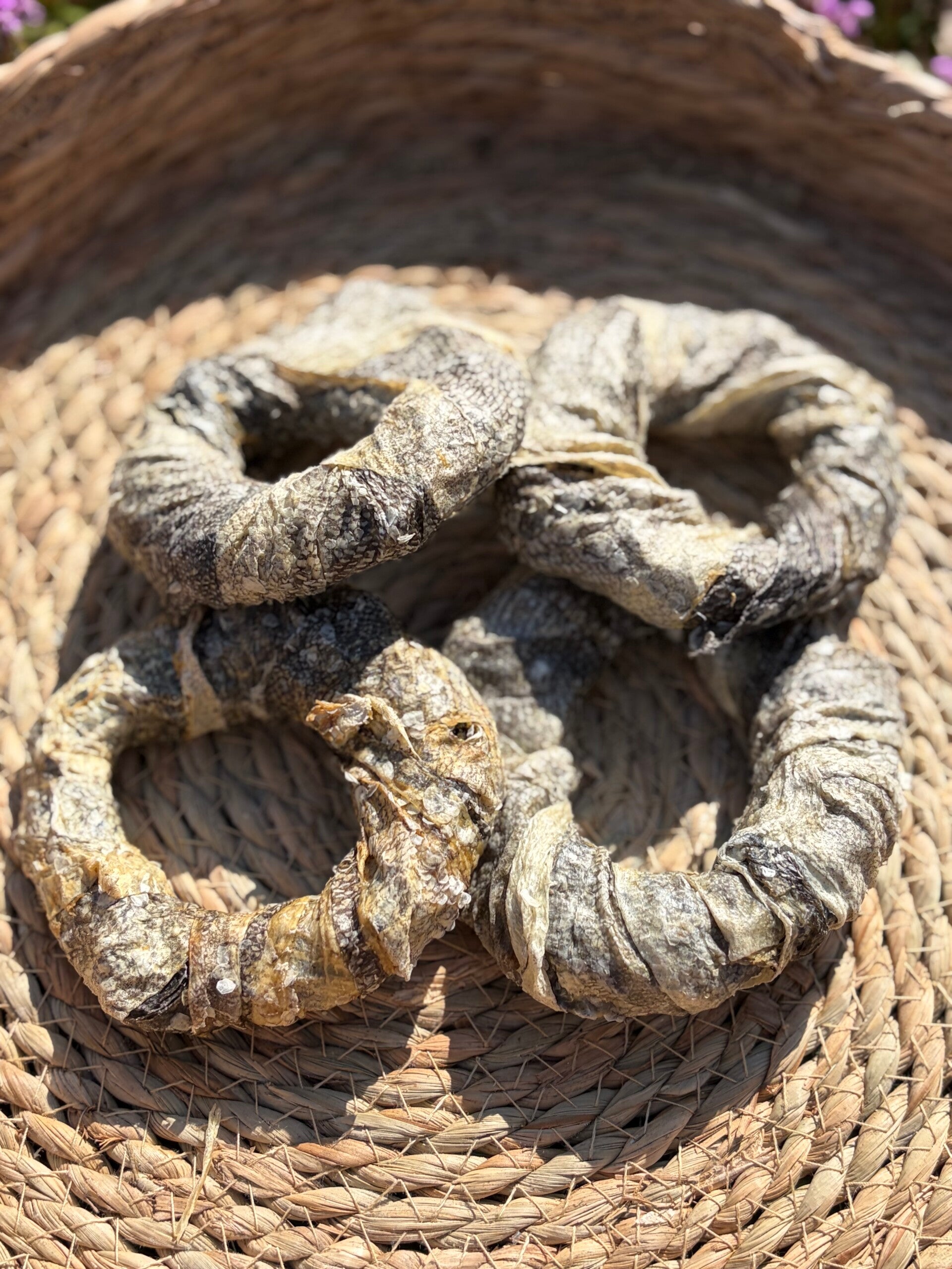 Onze kabeljauwhuid ringen zijn een heerlijke, gezonde traktatie voor jouw hond. Deze knapperige snacks zijn gemaakt van 100% gedroogde kabeljauwhuid en bevatten geen kunstmatige toevoegingen, geur-, kleur- of smaakstoffen.